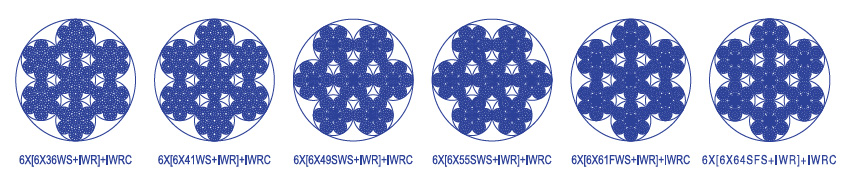 繩結(jié)構(gòu):6×[6x36WS+IWR]+IWRC 6×[6x36WS+41+IWR]+IWRC 6×[6x49SWS+41+IWR]+IWRC 6×[6x55SWS+IWR]+IWRC 6×[6x61FWS+41+IWR]+IWRC 6×[6x64SWS+41+IWR]+IWRC