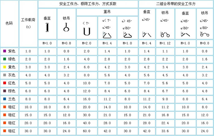 二、環(huán)形高強(qiáng)酸洗吊帶的安全工作力、極限工作力、方式系數(shù)及色碼